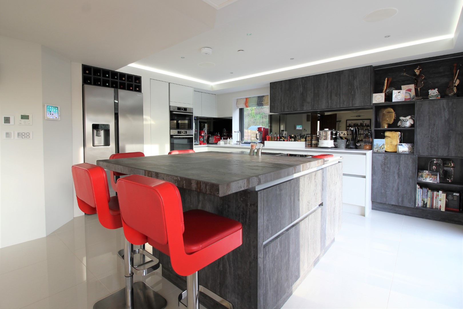 Our client wanted something a little different for his new kitchen, and was particularly keen on a modern, industrial look. Our H-Line true handle-less range offers a massive choice of colours and textures, many of which compliment each other – as can be seeh here, with the subtle Sutton Silk Scots Grey combining with the dramatic colour and texture of Deco Twilight.