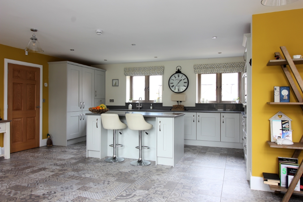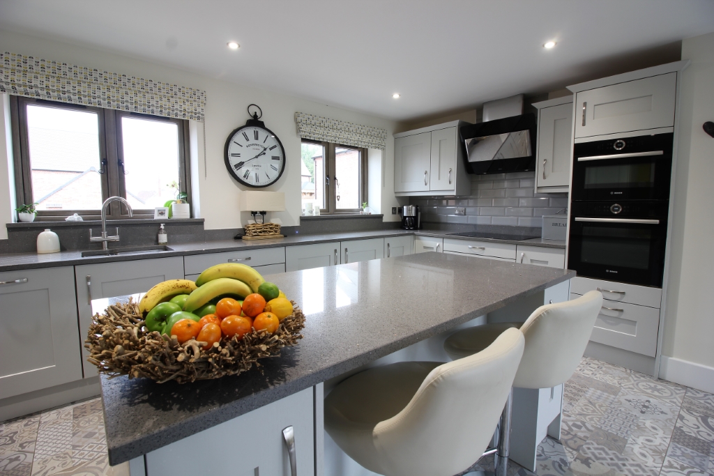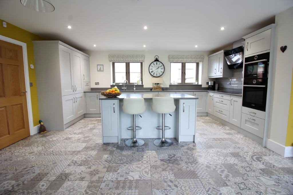 We were chosen to supply and fit kitchens for a small, prestigeous new-build development in Coleorton, Leicestershire. All four of the plots had large kitchen areas like this, so it was imperitave that the kitchen design was not only functional, but beautiful too. This is our Solva solid oak door, painted in light grey – a classic door that complimented the house nicely – combined with a Grey Stellar Silestone worktops to add a bit of sparkle!
